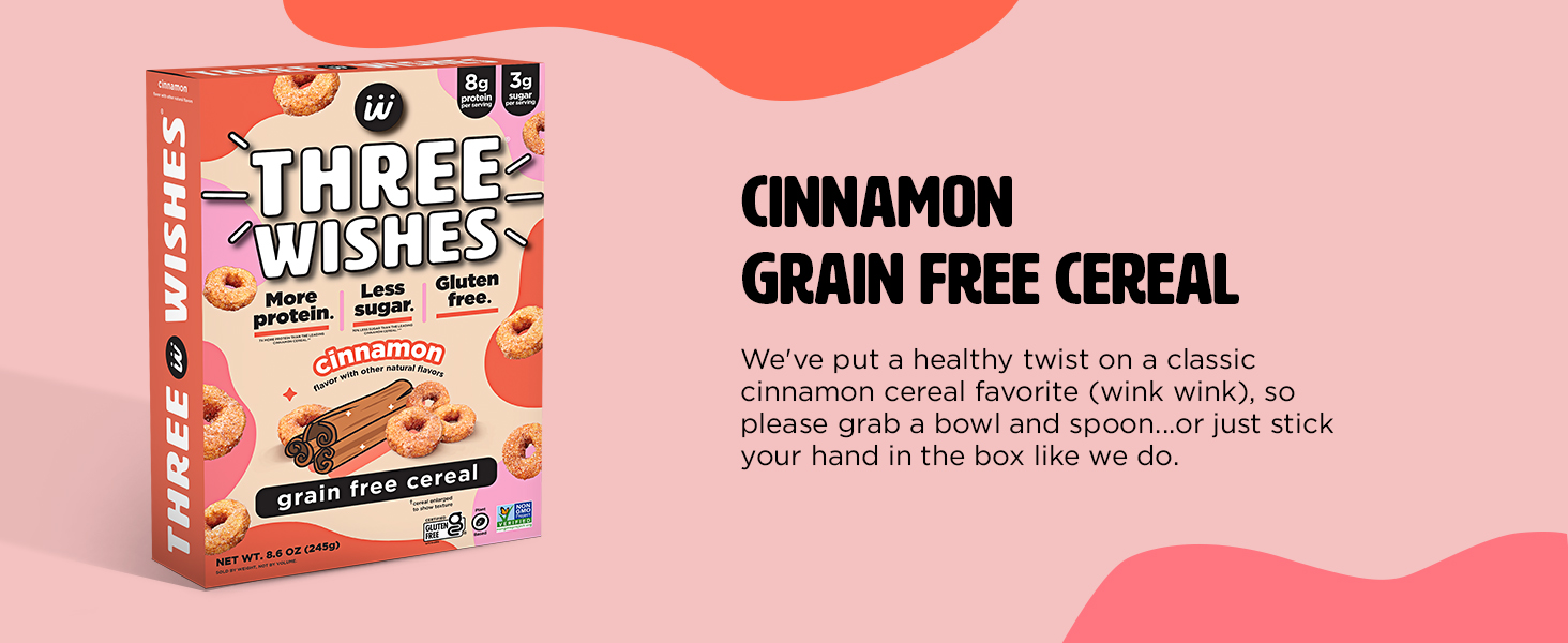 Three Wishes delivers the classic sweet cinnamon flavor you love with 8g of protein and only 3g of sugar per serving, while being grain-free, gluten-free, vegan, and plant-based — unlike many traditional cereals that are high in sugar and grains.